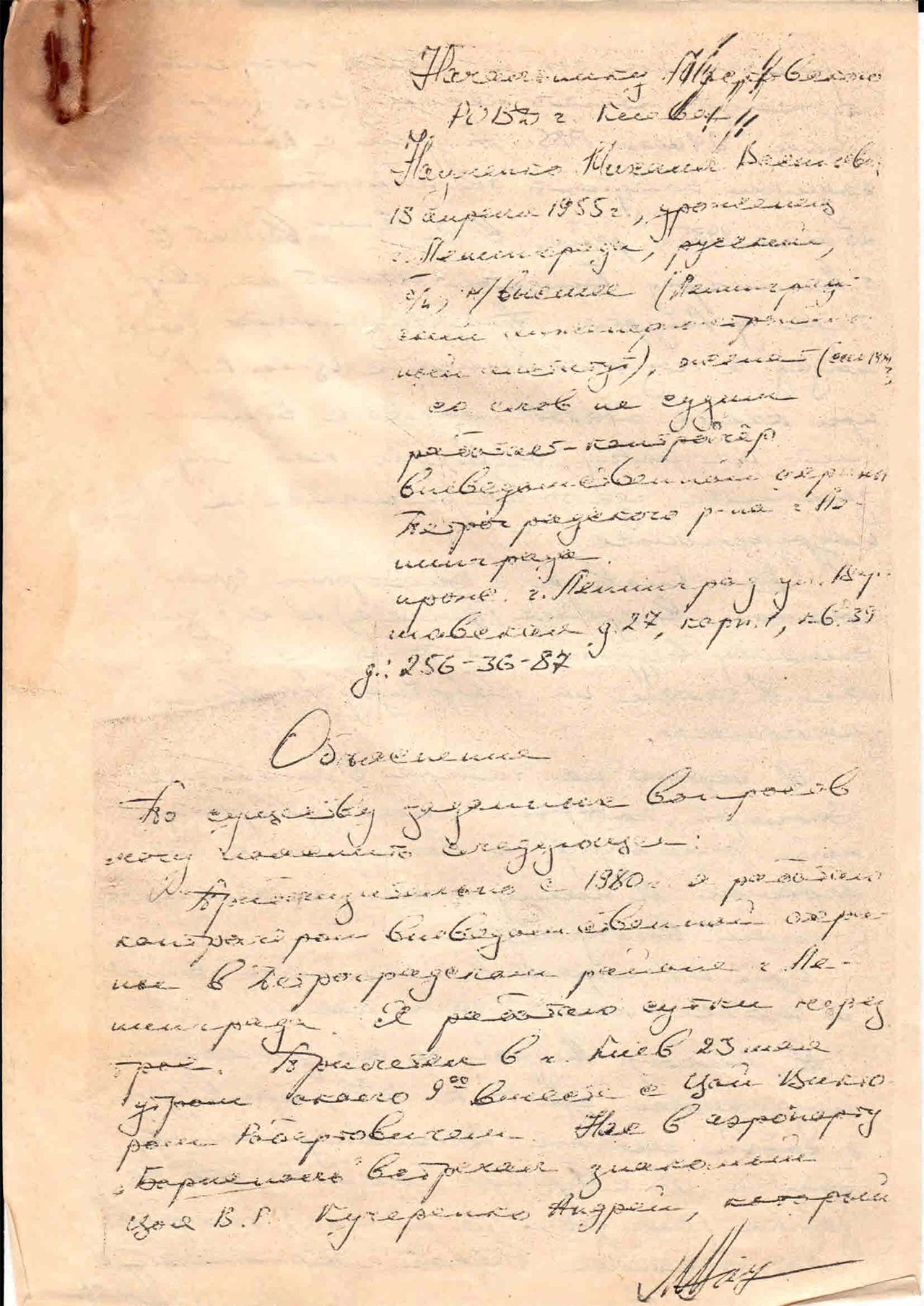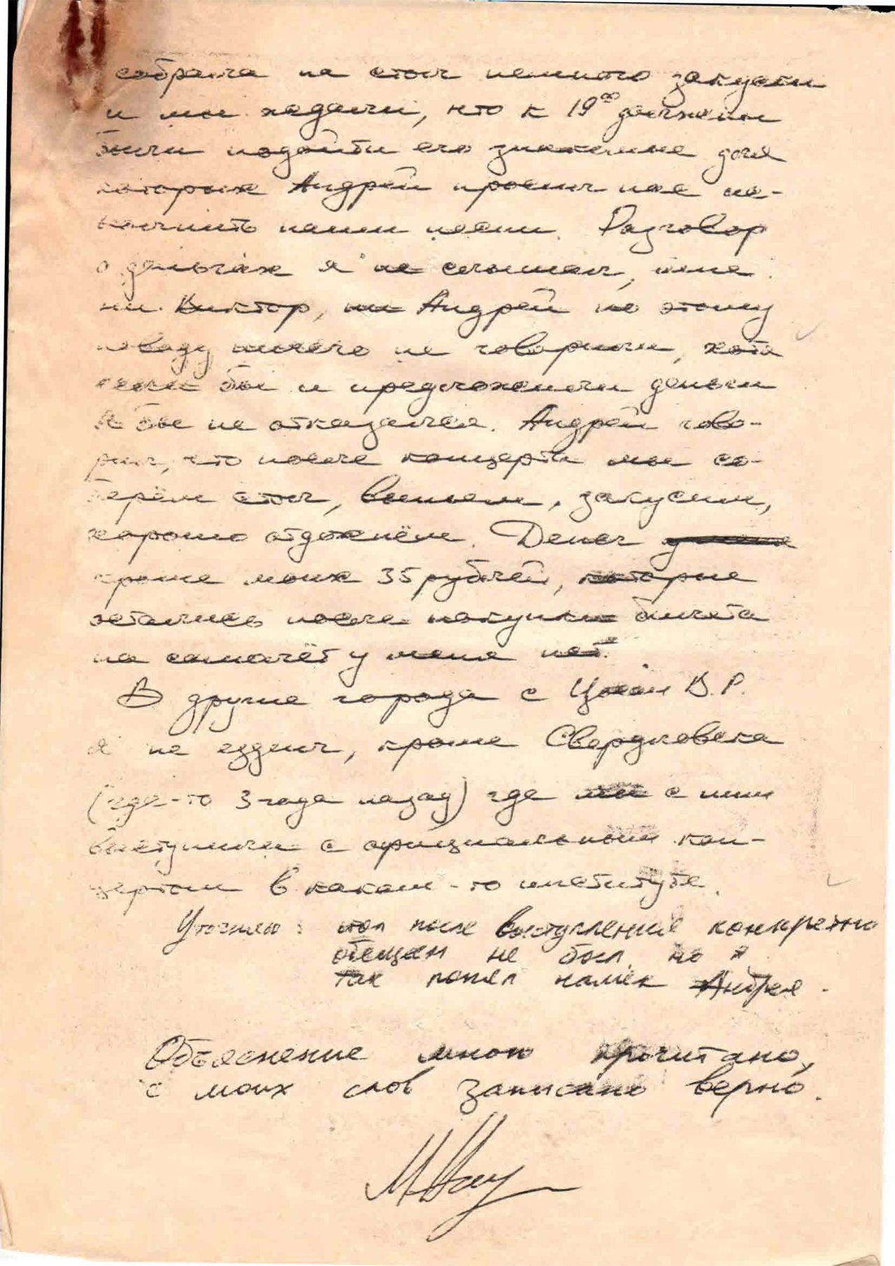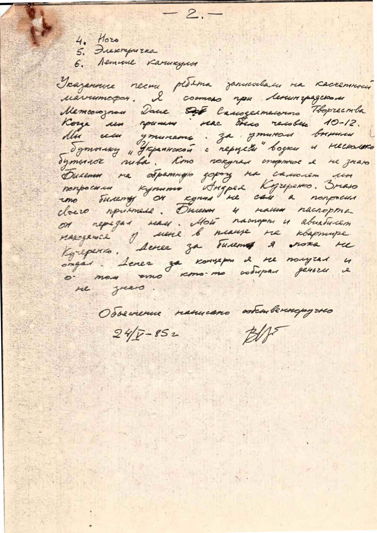 Указанные песни ребята записывали на кассетный магнитофон. Я состою при Ленинградском Международном Доме Самодеятельного Творчества. Когда мы пришли нас было человек 10-12. Мы сели ужинать, за ужином выпили бутылку «Украинской с перцем» водки и несколько бутылок пива. Кто покупал спиртное я не знаю. Билеты на обратную дорогу на самолет мы попросили купить Андрея Кучеренко. Знаю что билет он купил не сам а попросил своего приятеля. Билеты и наши паспорта он передал нам. Мой паспорт и авиабилет находятся у меня в плаще на квартире Кучеренко. Денег за билет я пока не отдал. Денег за концерт я не получал и о том, что кто-то собирал деньги я не знаю. Объяснение написано собственноручно. 24/V — 85