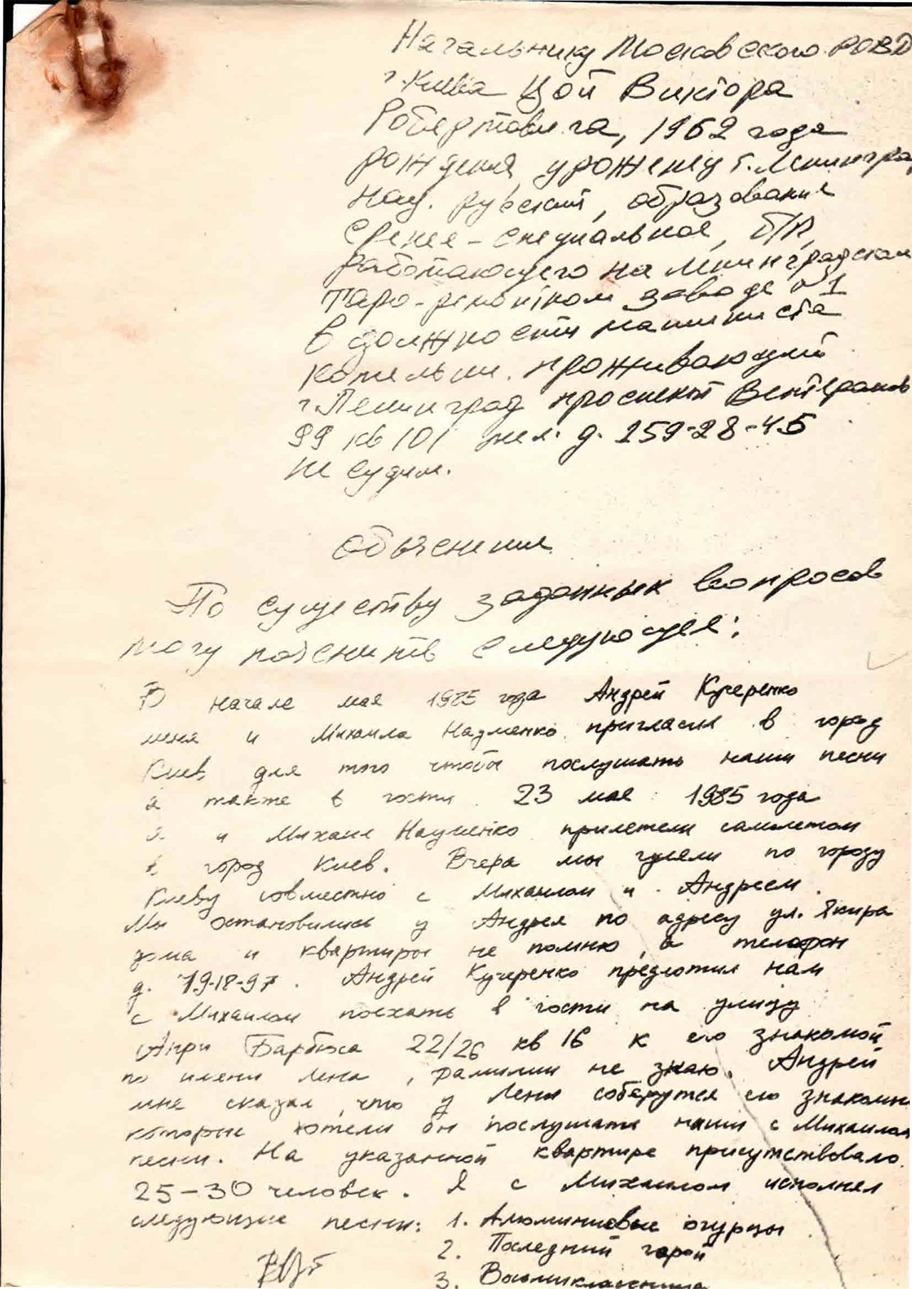 По существу заданных мне вопросов поясняю следующее. Я работаю в киевском политехническом институте преподавателем философии с декабря 1984 г. Незадолго до майских праздников сего года Александр Захаров предложил мне договориться с ленинградскими музыкантами Михаилом Науменко и Виктором Цоем, чтобы они приехали выступить в г. Киев перед группой любителей музыки. Они обратились именно ко мне потому что знали, что я был в марте сего года в г. Ленинграде на фестивале и там познакомился с музыкантами Науменко и Цоем. Захаров обратился именно ко мне потому что к нему с просьбой пригласить музыкантов обратилась группа любителей музыки из клуба художественной самодеятельности КПИ.