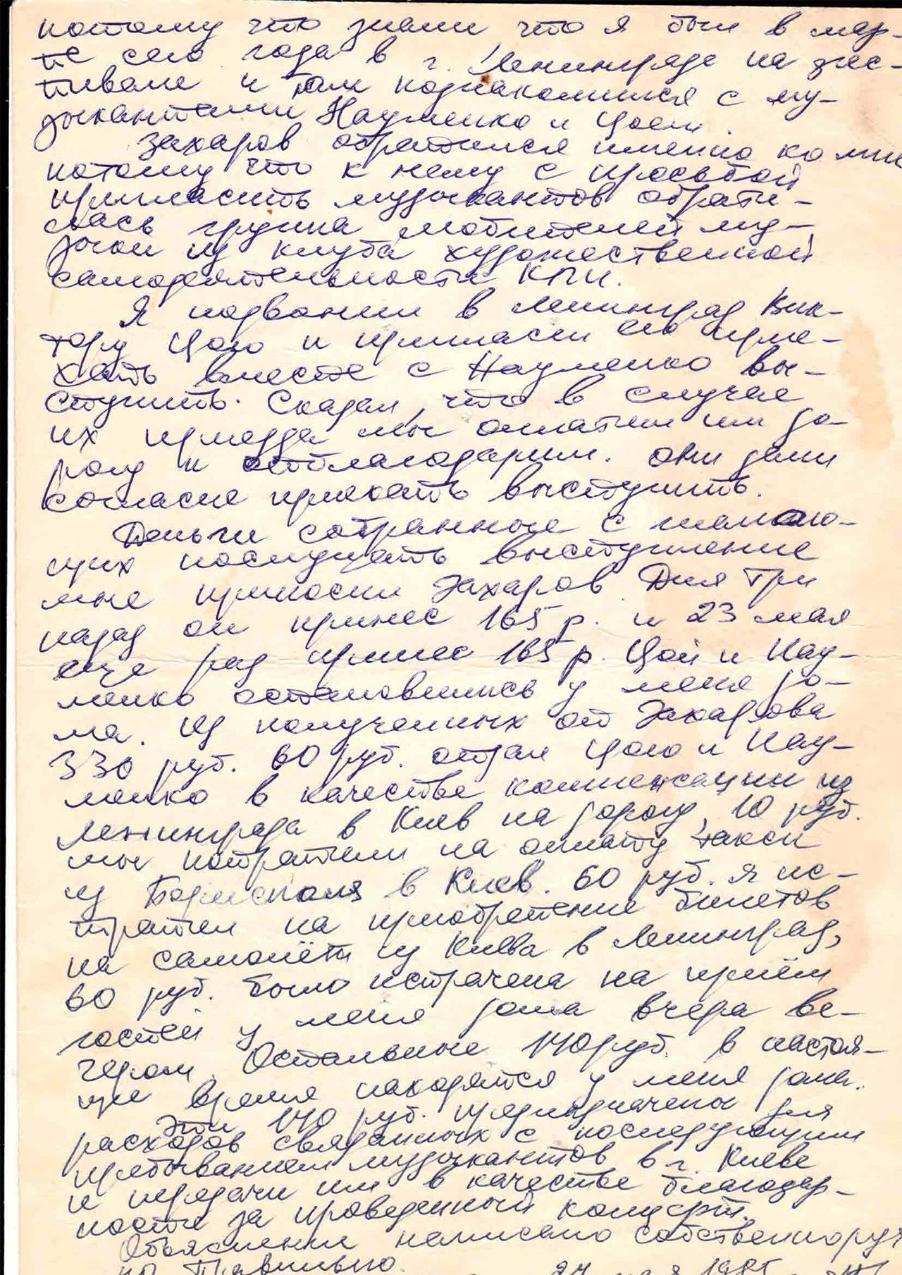Деньги собранные с желающих послушать выступление мне приносил Захаров. Дня три назад он принес 165 р. И 23 мая еще раз принес 165 р. Цой и Науменко остановились у меня дома. Из полученных от Захарова 330 руб., 60 руб отдал Цою и Науменко в качестве компенсации из Ленинграда в Киев на дорогу, 10 руб мы потратили на оплату такси из Борисполя в Киев. 60 руб я истратил на приобретение билетов на самолет из Киева в Ленинград. 60 руб было истрачено на прием гостей у меня дома вчера вечером. Остальные 140 руб в настоящее время находятся у меня дома.
