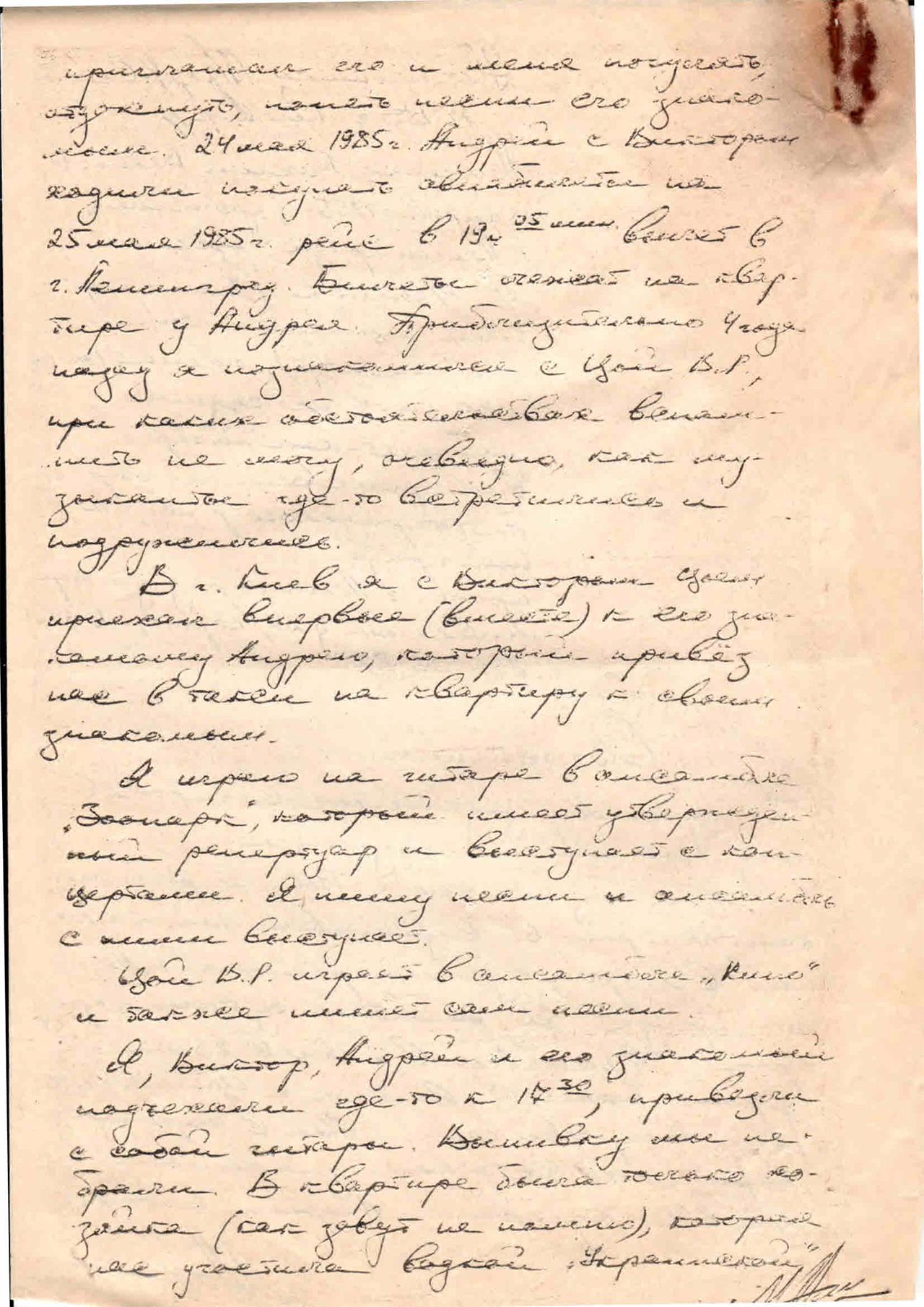 пригласил его и меня погулять, отдохнуть, попеть песни его знакомым. 24 мая 1985 г. Андрей с Виктором ходили получать авиабилеты на 25 мая 1985 г, рейс в 19:05 вылет в г. Ленинград. Билеты лежат в квартире у Андрея. Приблизительно 4 года назад я познакомился с Цой В.Р., при каких обстоятельствах вспомнить не могу, очевидно, как музыканты где-то встретились и подружились.
