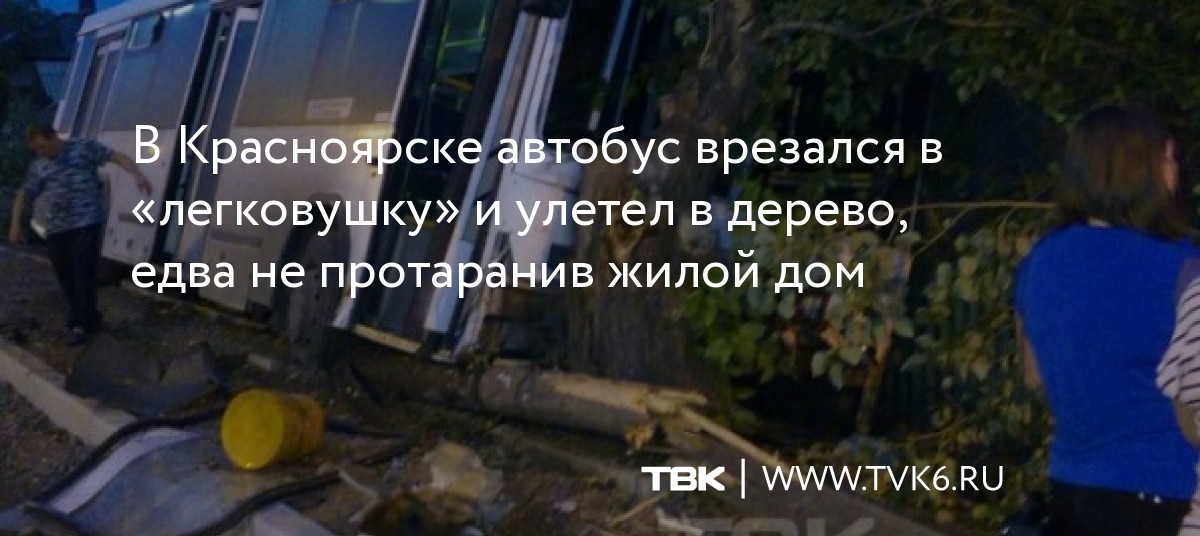 В Красноярске автобус врезался в «легковушку» и улетел в дерево, едва не протаранив жилой дом