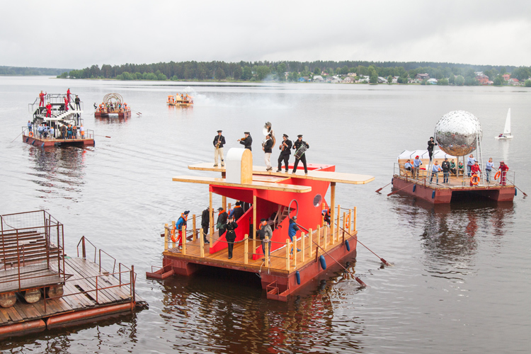© Colta.ru Работа Паши 183 «Сказка о потерянном времени», 2012 Еще одно популярное развлечение фестиваля — «арт-плоты», ставшие заметной частью «Арт-Оврага». Пять плотов создали Леонид Тишков, бюро Wowhaus, Жан-Филипп Пуаре-Виль, Екатерина Кулева и группа «Алыча». Все они проходили по ведомству архитектуры, как следовало из пресс-материалов. Тишков, понятное дело, установил на плоту луну — именно луну, шарообразную и с кратерами, а не ассоциирующийся с художником обычно светящийся месяц. Вообще решено было пруды использовать активнее, чем ранее. Недаром тема фестиваля в этом году — «Акватория». На местную публику, как и на иногородних гостей фестиваля, это произвело неизгладимое впечатление. Столпившийся на причале народ визжал и улюлюкал, когда плоты выплыли из-за мыса и медленно приближались к берегу. А уж когда стало понятно, что на плотах еще и можно кататься, радости не было предела.