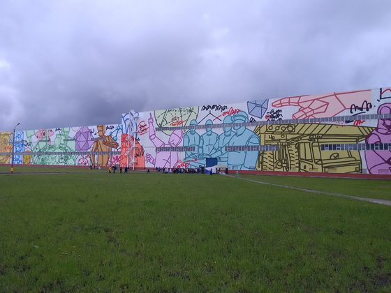 © Colta.ru Работа Миши Most на Выксунском металлургическом заводе ОМК На металлургическом заводе с помпой открыли «самый большой мурал на фасаде здания в мире» (из рассылки «Артмоссферы») за авторством Миши Most — совместный проект «Арт-Оврага» и московской биеннале стрит-арта «Артмоссфера». Автор презентацию дипломатично проспал, зато туда приехал довольный губернатор Нижегородской области Валерий Шанцев, а после его выступления — под знаменитый зачин из «Так говорил Заратустра» Рихарда Штрауса — бабахнули салют. Торжество несколько омрачалось тем фактом, что, как выяснилось, кто-то в мире успел обойти Мишу по размеру росписи, в Книгу рекордов Гиннесса он уже не попадал. К тому же непогода сказалась на состоянии работы: сделанный в последний момент перед самой презентацией кусок мурали смыло дождем, нужно было доделывать позже. Впрочем, это никого особо не смущало. Художник, расписавший за месяц 10 800 квадратных метров, был, по всей видимости, признан организаторами эффективным и успешным работником (это к слову о KPI), освоил бюджет как надо. Возможно, это самое желанное произведение для кураторов и спонсоров фестиваля — обсуждаемая тема, эффектная работа, масштабы, которые заинтересуют масс-медиа.