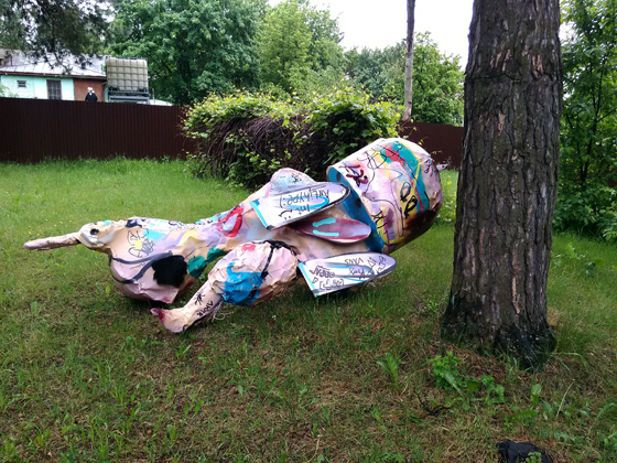 От того, третьего по счету, «Арт-Оврага», на который среагировала автор приведенной выше цитаты, в городе осталось очень много работ — деревянный единорог венгерского художника Габора Миклоша Соеке, который стоит в парке Баташевых в центре Выксы, множество граффити, разбросанных по разным районам. В этом году было решено во дворы и на стены жилых домов особо не лезть, сосредоточиться на площадках, где жители города не будут возражать против появления искусства (говорят, многим были не по душе граффити на торце родного дома). Таких площадок нашлось две: одна — завод ОМК, вторая — небольшая площадь между музеем, где проходила выставка Политеха, и Верхневыксунским прудом (в том числе и сам этот водоем).