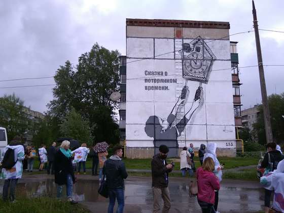 © Colta.ru Выставка «Можно из-под крана?!» Эти два проекта, естественно, не приковывали к себе столько внимания публики, сколько вся остальная программа, а это, повторюсь, в основном зрелищные проекты — паблик-арт и стрит-арт. Задача у этого массового затейничества примерно такая же, как и во многих других городах и весях по всему миру. Выставки и фестивали на крайнем севере Норвегии или на ее границе с Россией, например, рассчитаны на один и тот же эффект — сделать вовлеченные города привлекательными, прежде всего, для собственного населения и остановить отток жителей, главным образом молодежи. Но, как писала четыре года назад уроженка Выксы Анастасия Бирюкова, «даже не будучи знакомым с городом ранее, нетрудно заметить, что озвученная цель вступает в конфликт со средством, а именно — форматом фестиваля. Событие является массовым и временным, за “подаренными” фестивалем объектами, в том числе спортивными сооружениями, в течение сезона никто не следит». Бирюкова тогда верно заметила, что нужно от фестиваля переходить к более регулярной программе — растягивать культурную активность с трех дней на весь год. Видимо, это была не единственная критика такого рода, потому что в нынешнем году организаторы говорили о подобном переформатировании «Арт-Оврага» как о стратегии ближайшего будущего; пока это, правда, скорее планы. Однако те же арт-резиденции уже выходят за пределы фестивального периода — симптоматично, что Алиса Багдонайте во время фестиваля отсутствовала. У нее, конечно, могли быть дела по другим проектам, которыми она занимается, но в целом график резиденций и фестиваль именно что не были состроены.