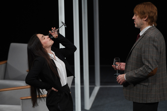 © Владимир Вяткин / РИА Новости Софья Райзман (Рейн) и Артем Соколов (Ричард и Кен) Всякий раз, когда Джек признается, что ходил к проститутке, а Гэйб беседует с соблазнительным мышонком по имени Рейн (Софья Райзман), на сцене появляется персонаж Артема Соколова (в программке — Ричард и Кен), печально изображающий то оленя (руки заменяют рога), то зайчика (уши — ладони), то индуса (на голове полотенце), в машине которого забыта рукопись Гэйба. Джек уходит от жены к инструкторше по аэробике Сэм: Светлана Колпакова успевает поведать о соевых бобах, знаках зодиака и балете «Олениана» с оленятами — каждый ее выход становится аттракционом. О сексе Гэйб и Джуди говорят, расходясь по сцене на все большее расстояние, зато Джуди все чаще присаживается на диван к коллеге Майклу (Сергей Чонишвили): решив поделиться с ним своими стихами, делает руки книжечкой и произносит пушкинским ямбом «бу-бу-бу-бу…», потом читает биографию «великого скандинавского драматурга Йоргена Йобсона», автора знаменитой пьесы «Всюду гуси», — все это Дарья Мороз проделывает с такой королевской невозмутимостью, что зал восторженно стонет.