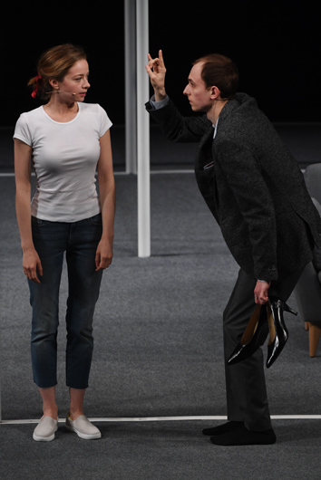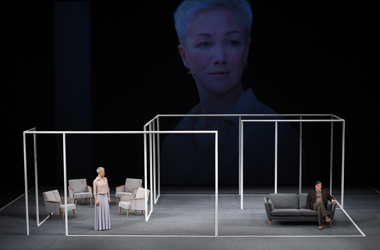 На первый взгляд, все вроде бы просто: «Мужья и жены» — спектакль «про отношения», сюжет самоигральный и как будто не требующий активного режиссерского участия. Но странности начинаются с первой же минуты: пока занавес еще не открылся, на него проецируются фигуры сидящих на сцене Гэйба и Джуди — впрочем, на это можно и не обратить внимание. Как можно не заметить и режиссерских усилий, растворенных в скупой, филигранной актерской игре, настолько лишенной нажима, что может показаться, будто и нет никакой игры: люди спокойно ходят по сцене, вполголоса выясняя отношения, а зал то и дело хохочет.