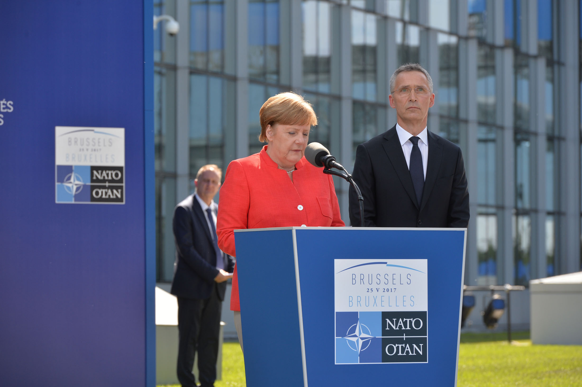 Ангела Меркель на саммите НАТО в Брюсселе 25 мая 2017 nato.int Bloomberg комментирует, что тема оборонного бюджета сейчас так живо интересует социал-демократов потому, что их программа включает в себя ряд социальных бонусов, в том числе сокращение налогов для граждан с небольшим доходом и стабилизацию ситуации с пенсиями. Также автор оговаривает, что такой интерес Шульца именно к теме Трампа может говорить о том, что отношения Германии с США могут стать одним из важных полемических моментов на грядущих выборах.