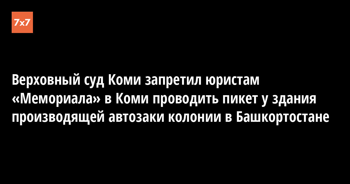 Верховный суд Коми 26 июня отменил решение Сыктывкарского городского суда, который разрешил юристам Коми правозащитной комиссии «Мемориал» провести пикет у исправительной колонии №7 в башкирском Мелеузе, передает корреспондент «7x7».
