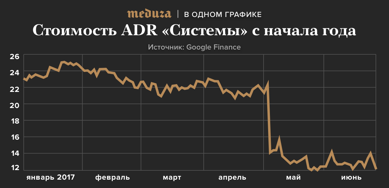 В 2014 году Forbes оценивал состояние Евтушенкова в девять миллиардов долларов, в 2017-м — в 3,5 миллиарда. А вот как упали депозитарные расписки «Системы» на Лондонской бирже, когда стало известно об иске «Роснефти»: