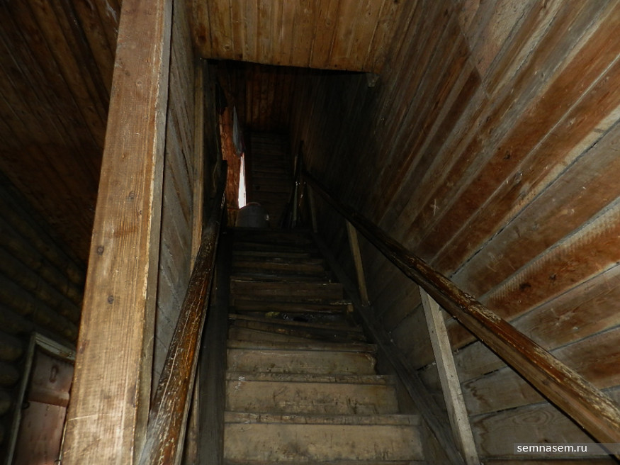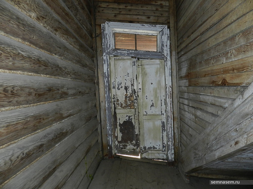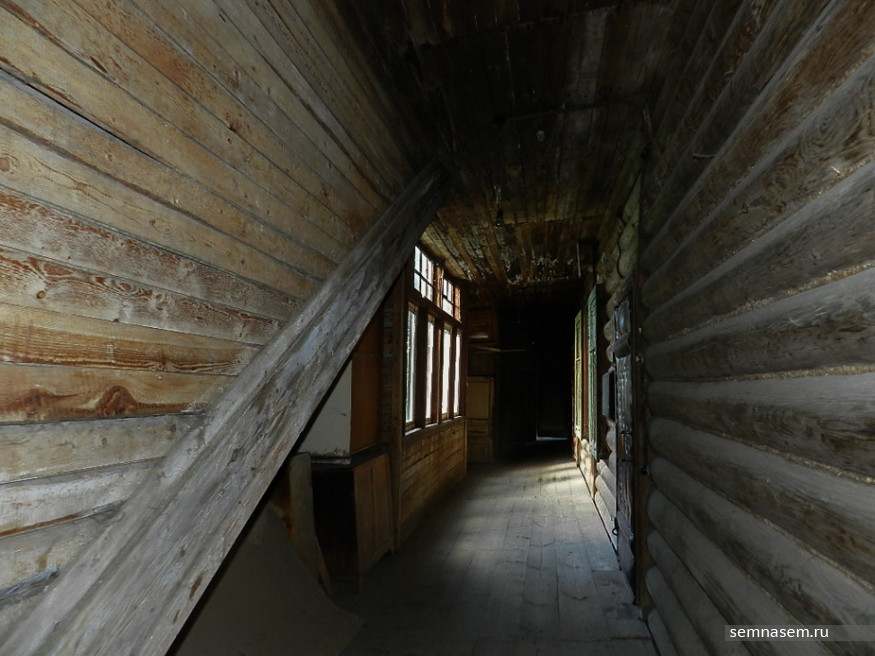 Сразу же при входе обдает «ароматами» общественного туалета: по всей видимости, он тут, в коридоре, за закрытой на амбарный замок дверью. Окна нескольких комнат выходят на веранду, а ее окна — на современный многоквартирный дом со всеми удобствами. С потолка на длинном проводе свисают лампочка без плафона и квадратные метры паутины с навсегда попавшимися в нее насекомыми. Полы, двери и лестница крепкие, но перекосившиеся и просевшие от старости.
