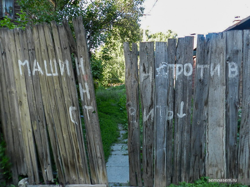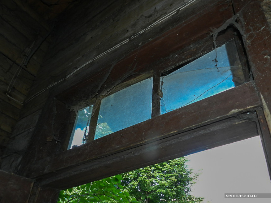Еще издалека становится понятно, что дом пользуется вниманием подростков: они исписали фанерные ставни, которыми общественники заколотили оконные проемы. Часть высокого фундамента откололась, во дворе навалены кучи хлама, к стене аккуратно прислонена часть дивана — по всей вероятности, для удобства вечерних посиделок со спиртным. Доски самого здания где-то позеленели от плесени, а где уже прогнили дочерна: необитаемый дом всю зиму и дождливую весну простоял без отопления.