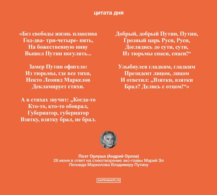 Поэт Орлуша 26 июня творчески прокомментировал стихотворное обращение бывшего главы Марий Эл Леонида Маркелова к президенту из СИЗО. Для издания OpenEconomy он написал стихи с предполагаемым ответом Владимира Путина Маркелову.