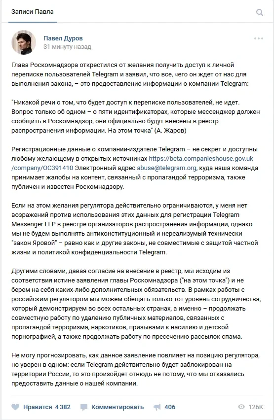 Последнее же заявление, кажется, было сформулировано создателем Telegram намеренно двусмысленно. Дуров не говорит, что он намерен вносить данные компании в реестр Роскомнадзора. Он утверждает лишь, что эти данные и так общеизвестны, и что он не возражает против их внесения в реестр. Кто должен вносить данные, условно, Дуров или Жаров, остается при этом открытым.