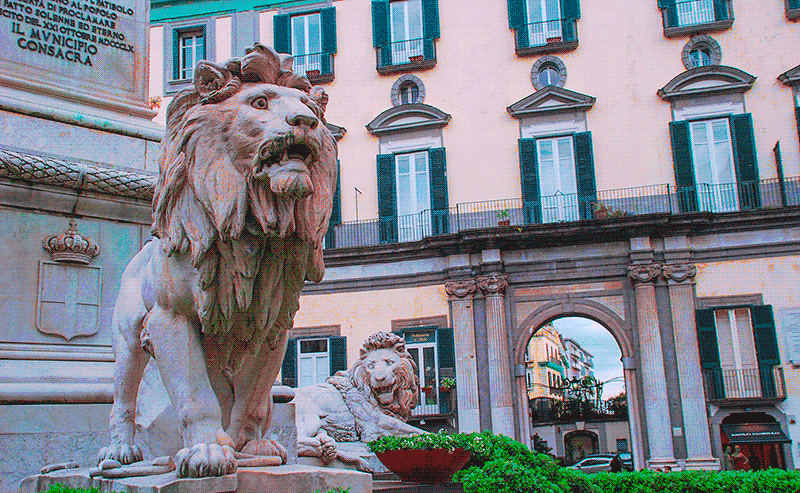 Львы в вечернем свете выглядят грозно, особенно тот, что выступает вперед, словно готовясь к прыжку. Он не сводит с путника каменных глаз, и невольно задумаешься, свидетелем скольких перемен он стал за полтора столетия. Времена основного действия романов Элены Ферранте приходились как раз на его вековой юбилей.