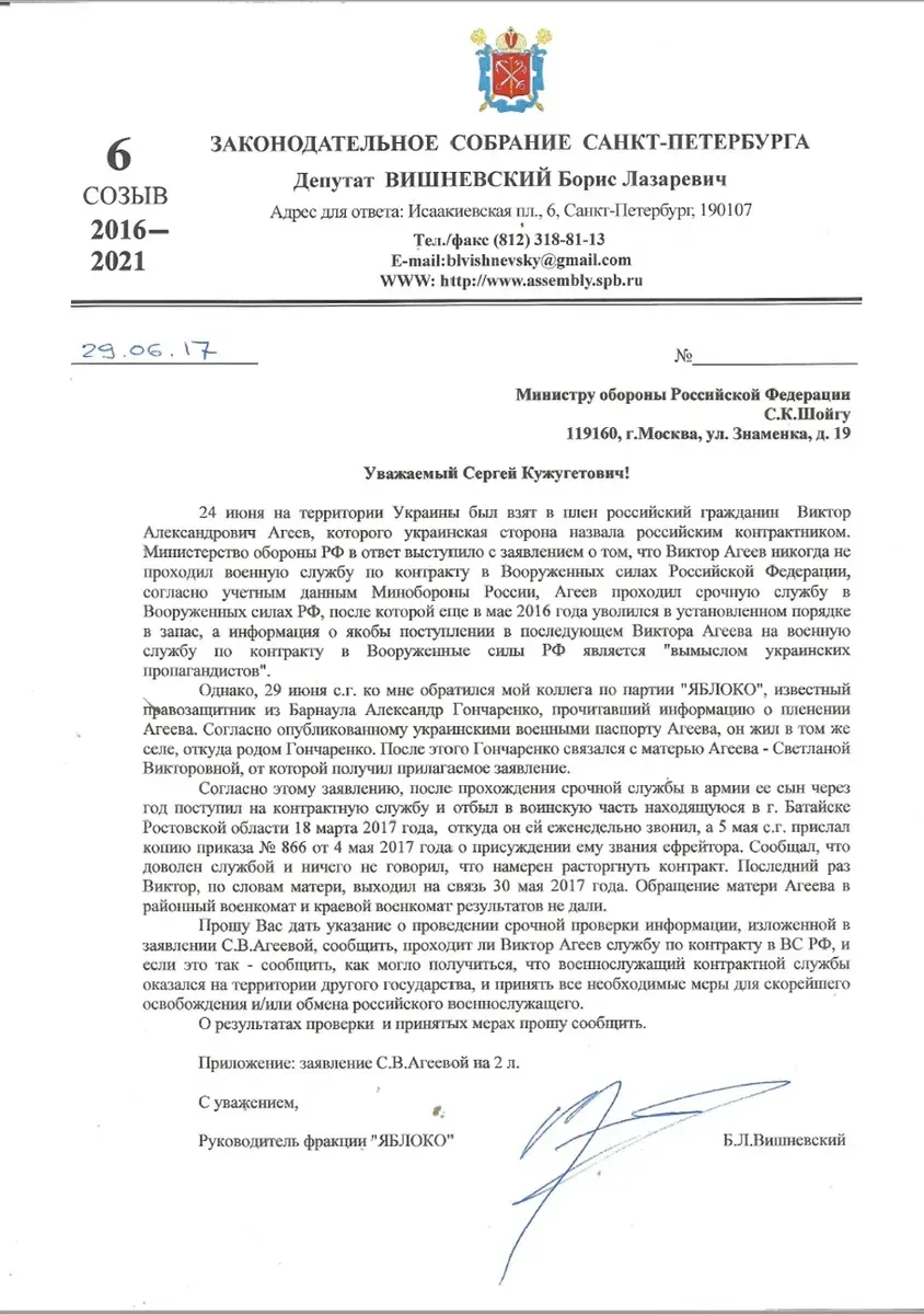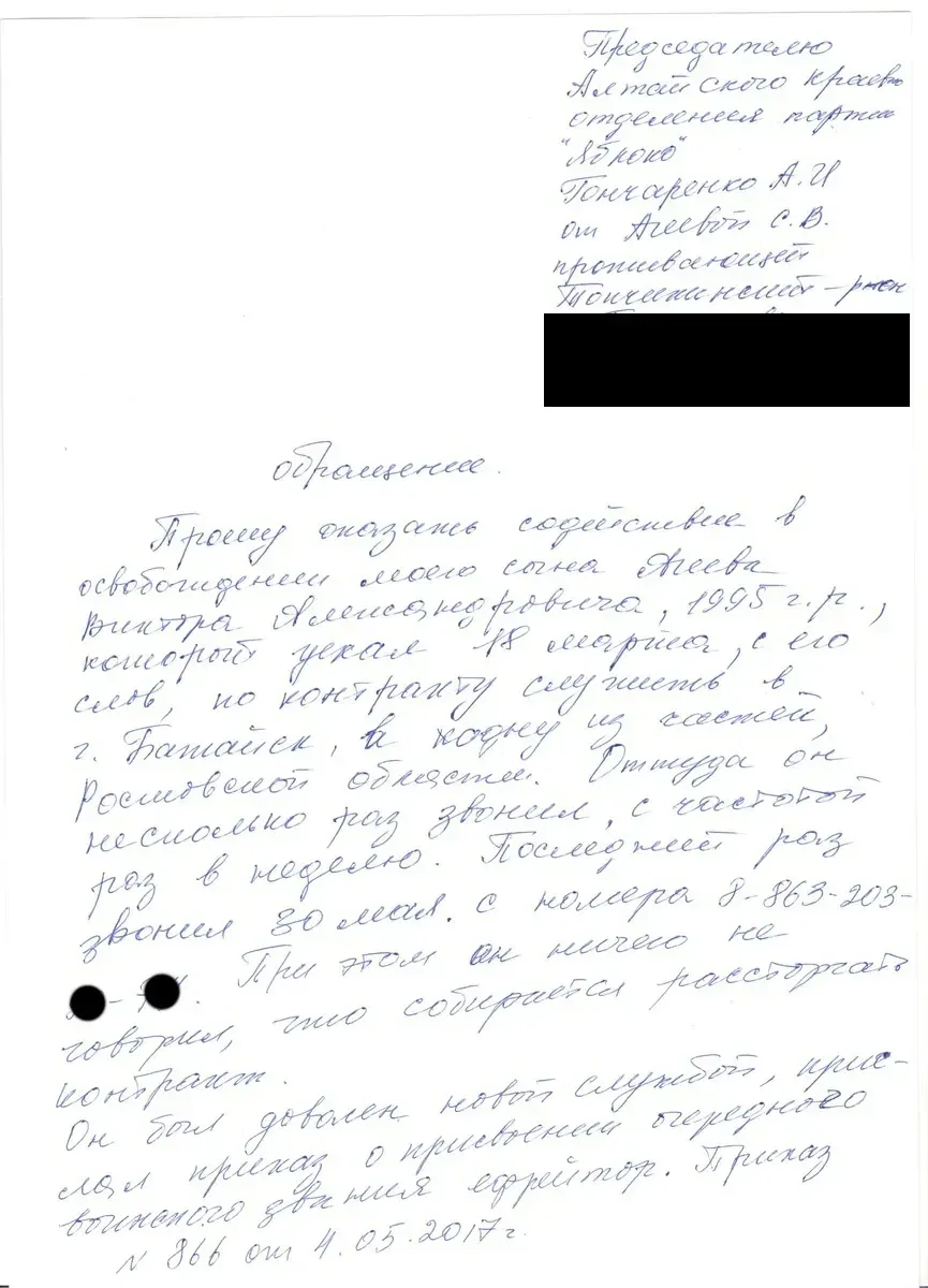 Прошу оказать содействие в освобождении моего сына Агеева Виктора Александровича, 1995 г.р., который уехал 18 марта, с его слов, по контракту служить в г.Батайск, в одну из частей Ростовской области. Оттуда он несколько раз звонил, с частотой раз в неделю. Последний раз звонил 30 мая с номера <...>. При этом он ничего не говорил, что собирается расторгать контракт.Он был доволен новой службой, прислал приказ о присвоении очередного воинского звания ефрейтор. Приказ № 866 от 4.05.2017г.