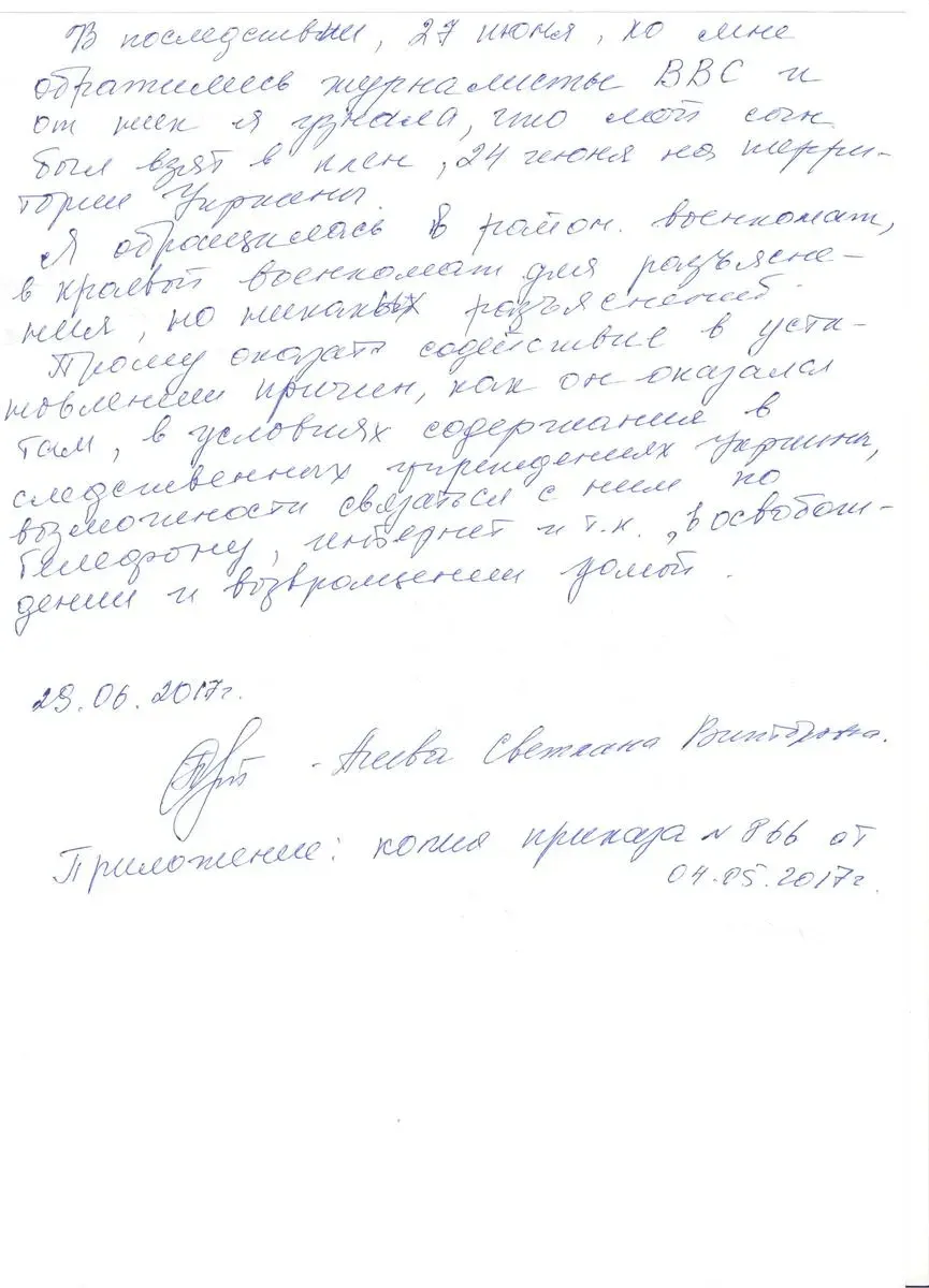 В последствии, 27 июня, ко мне обратились журналисты ВВС и от них я узнала, что мой сын был взят в плен, 24 июня на территории Украины.