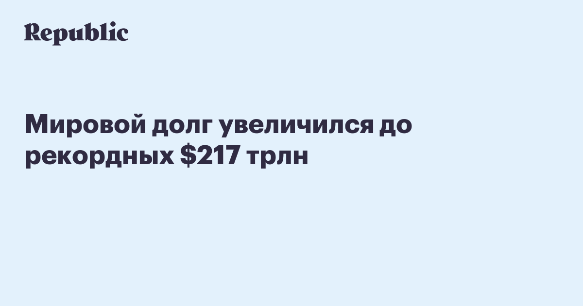 Размер мирового долга в первом квартале 2017 года увеличился до рекордного значения в $217 трлн, что составляет 327% глобального ВВП. Об этом сказано в обзоре мирового долгового рынка, подготовленного Институтом международных финансов, пишет РБК.