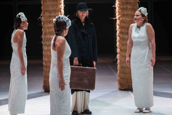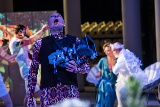 С Олимпа действие переносится на грешную землю, и к нему примешивается терпкий запах лихих 90-х. Кого и чего тут только нет. Братки на рынке с грузинским акцентом. Шалманы, где кокаин закусывают солеными огурцами. Группа «Ласковый май» и ее бессмертные «Розовые розы Светке Соколовой». Какая-то китайщина, соседствующая с длинными русыми косами нежных дев. Черепа. Черный ангел смерти с рогами. Посреди сцены лежит мертвый осел. Персонажи путают понятия «отеческие» и «аттические». Томно-маскулинная Венера (Лера Горин) поет «Темную ночь» и велит трубить в зеленые трубы. В целом все очень похоже на крематорий.