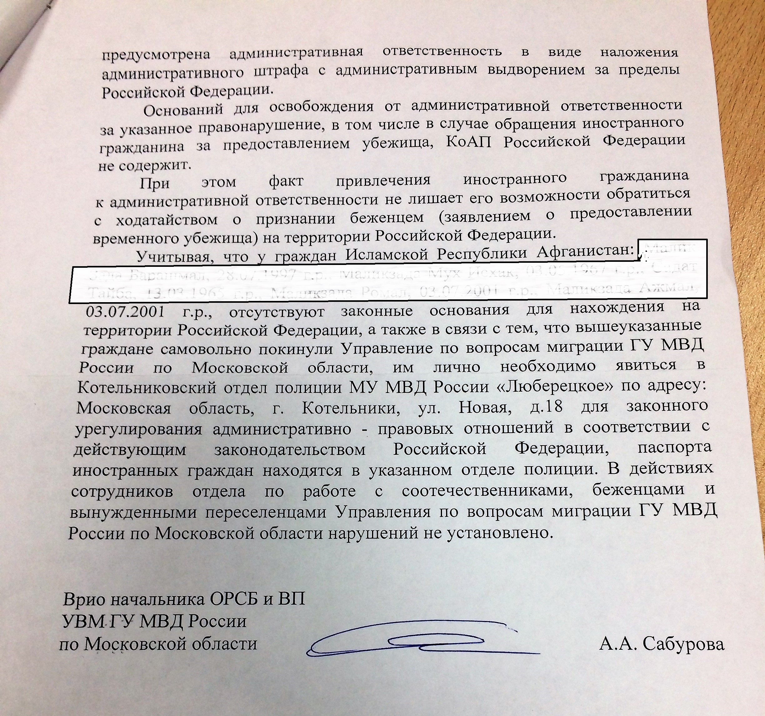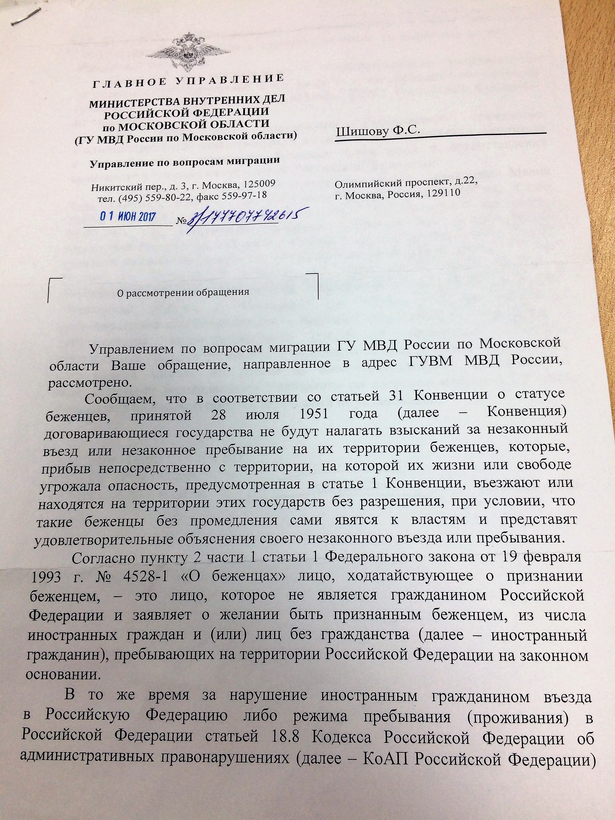 Кроме того, миграционная служба противоречит сама себе: они признают, что беженца нельзя привлекать к административной ответственности, если он сам явился к властям, цитируют Конвенцию о статусе беженцев. А далее в том же документе пишут, что оснований для освобождения беженцев от административной ответственности, согласно Кодексу об административных правонарушениях, в России, нет, – говорит Шишов.