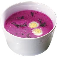 К подобного рода супам, которые сначала варятся, а затем перед подачей на стол охлаждаются, относятся украинский, белорусский и литовский свекольники. Литовский холодный борщ, несмотря на скромность и простоту, в этом ряду — несомненный лидер. Тут, как и в случае с ботвиньей, многое строится на контрасте предельно холодного супа и горячего картофеля. Литовский холодный борщ от ботвиньи отстает на одну тарелку — его подают без льда. Вот только предварительно надо отварить свеклу, охладить, нарезать соломкой, также нарезать зеленый лук и укроп и опустить в подсоленный, взбитый в миксере кефир, слегка разбавленный холодной кипяченой водой. В каждую тарелку — половинку вареного яйца, сметану, на отдельной тарелке — горячий отварной картофель, посыпанный укропом. Берешь ложкой картошечки, потом холодного борща. Эффект волшебный!