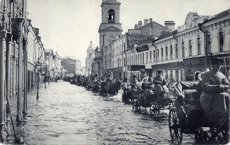 В 1908 году зима стояла до середины апреля, а потом Москва-река, Яуза и Водоотводный канал разлились так, что затопили пятую часть города. Уровень воды поднялся на девять метров