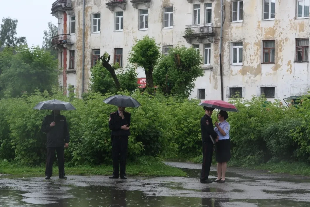 У организаторов, одетых в дождевики, все подготовлено: две большие колонки укрыты черным целлофаном, открытая крышка багажника припаркованной рядом «Лады»-универсал служит козырьком для выступающих. Перед митингом волонтеры сами убрали на площади мусор и битое стекло — три внушительных пакета ждут отправки на газоне. В отдалении дежурит машина «скорой». Четыре полицейских наблюдают за происходящим из-под зонтов с другого конца площади.
