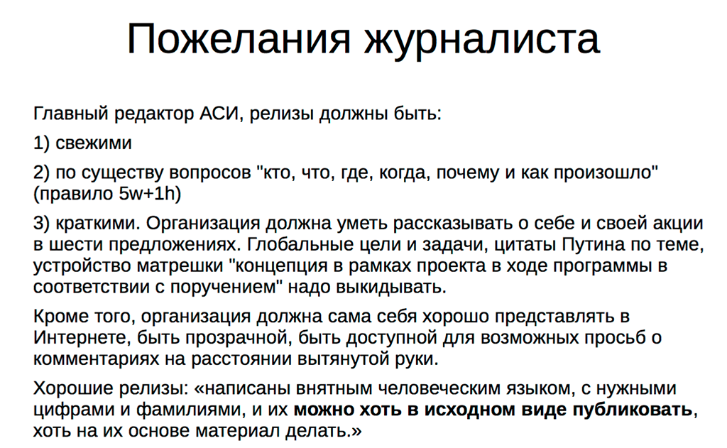 - Пресс-релиз о митинге необходимо разослать в течение нескольких часов. Некоторые СМИ в воскресенье до 13:00 пишут новости на понедельник.