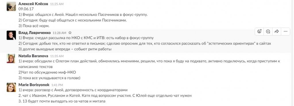 На таких встречах участники команды отвечают на три вопроса: что они сделали вчера, что будут делать сегодня и с какими трудностями столкнулись. С помощью таких ежедневных планерок каждый сотрудник знает, чем занимались его коллеги. Все в курсе событий, изменений и трудностей проекта.