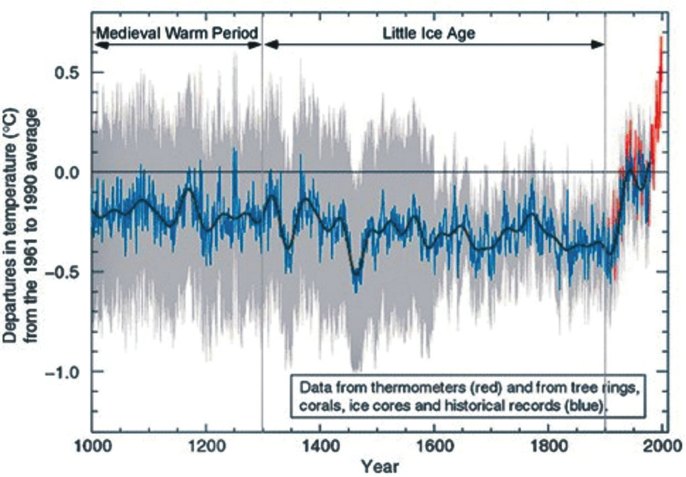 - «Хоккейная клюшка» (реконструкции температур за прошедшие 1000– 2000 лет с использованием годовых колец деревьев, кернов льда, кораллов и других индикаторов) не фальсифицирована. Она подтверждается множеством исследований. Температура начала резко повышаться в XX веке, и глобальные температуры последних нескольких десятилетий самые высокие за 1000 лет.