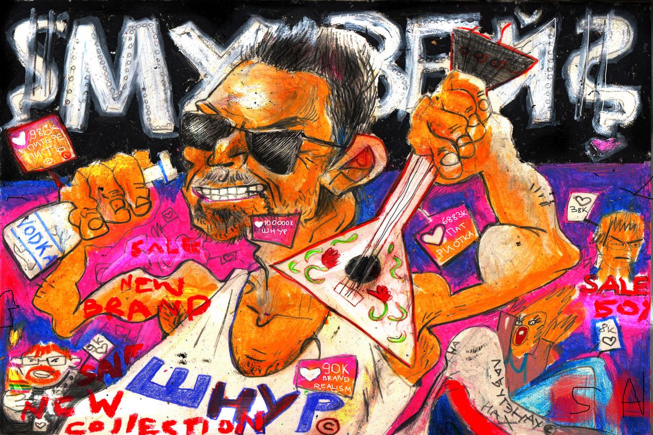 В начале шестидесятых Энди Уорхол создал серию картин с банками супа Campbell, а в 2017 году имитирующие упаковку сгущёнки чёрные банки с надписями «густо» стоят на выставке брендреализма (конечно, работа называется «Нефть»). Ярко-розовая скульптура из пластика в виде перевёрнутых яичек в мошонке под названием «Лайк», краники самоваров из пластиковых плит, вязаный портрет Земфиры в национальном татарском костюме невесты «Земфира жив», очки с голубыми стёклами и рюмка на пустом столе (композиция «Лепс спел»). Вместо уорхоловской Мэрилин у Шнурова — Земфира. Вместо анонимного хулигана Бэнкси — анонимный манекен в адидасе, пытающийся написать на розовой стене с логотипом «Найк» самое известное в России слово (композиция называется «Левша» с намёком на универсальную русскую одарённость). Вместо захоронений Йозефа Бойса (Палаццо Регале, 1985) — гроб в виде холодильника Coca-Cola, набитый сахарными кубиками до краёв. И десяток других символических экзерсисов.