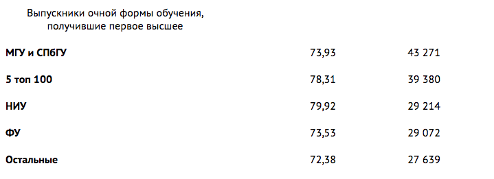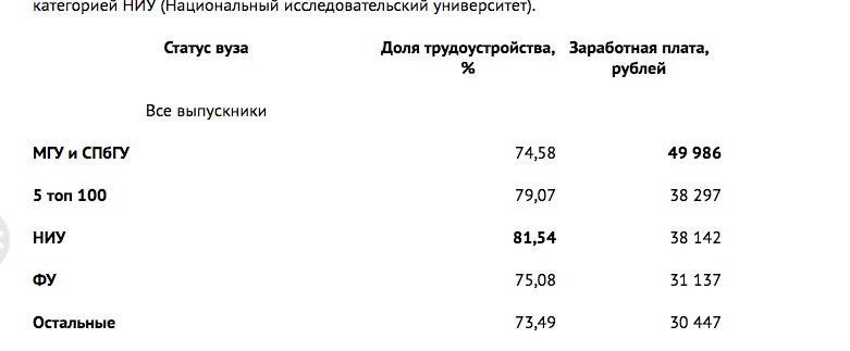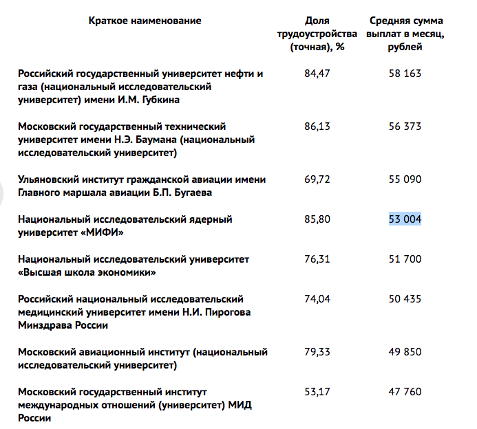 Самые высокие средние зарплаты у выпускников Российского государственного университета нефти и газа имени Губкина — 58,1 тысяч рублей. Выпускники МГТУ имени Н.Э.Баумана получают 56,3 тысяч рублей На третьем месте оказался Ульяновский институт гражданской авиации имени Б.П.Бугаева — 55 тысяч рублей. Затем идут МИФИ (53 тысячи рублей) и Высшая школа экономики (51, 7 тысяч рублей).