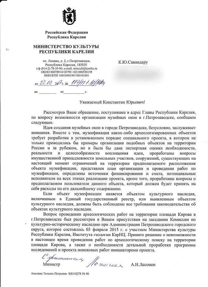 Именно Татьяна Амелина значится исполнителем документа, в котором Министерство культуры Карелии наотрез отказывало Константину Савандеру в проведении каких-либо работ в границах «Петровской слободы». Однако сейчас такого факта чиновница вспомнить не может: