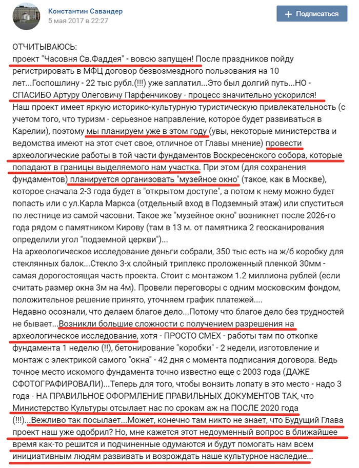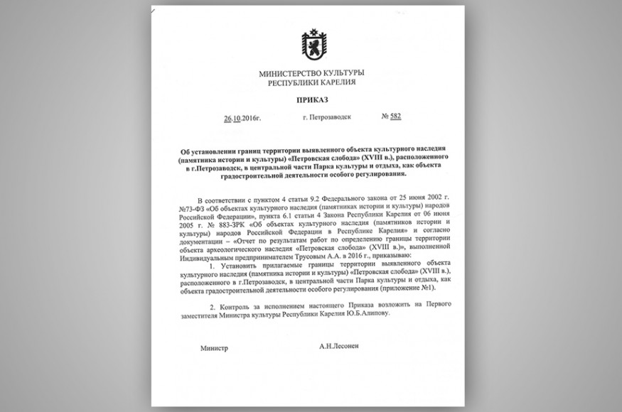 — В том месте, где предполагается строительство часовни, есть культурный слой XVIII столетия с Петровской слободой. А если перенести вопрос в юридическую плоскость, то 26 октября 2016 года был подписан приказ министерства культуры [Карелии] о границах территории «Объект археологического наследия „Петровская слобода“». Тот участок, где предполагается строительство часовни, полностью входит в эти границы.