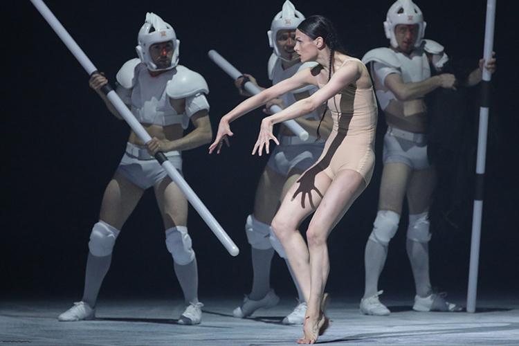 Мы совсем не против того, чтобы классическая par excellence, обладающая колоссальным физическим ресурсом труппа Мариинского театра танцевала босиком и по невыворотным позициям — возможно, такая смена языка пойдет ей на пользу. Мы даже знаем примеры балетов с бутафорией и без хореографии: так сделаны все последние крупные работы Александра Экмана. Принципиальная разница заключается в том, что Экман, которого роднит с Варнавой умение эффектно пускать театральную пыль в глаза, в отличие от петербургского хореографа, всегда выстраивает сложную ритмическую партитуру. «Ярославна» же на протяжении трех актов страдает отсутствием ритмической воли — вялая пластическая машина спектакля каждую секунду грозит заглохнуть: сколько-нибудь протяженные enchaînements, то есть связки движений, не выстраиваются, многофигурный кордебалет движется сплошной вязкой массой без попыток хореографа эту массу структурировать в пространстве и времени. Такая аритмия удивительна на фоне поджарой, напряженной до судороги, ритмически и темброво хлесткой музыки Бориса Тищенко.