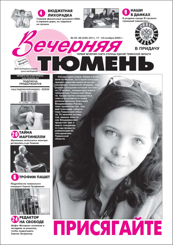 18 ноября 2005 года газета «Вечерняя Тюмень» вышла с огромным портретом Анастасии Раковой на первой полосе и подписью «Присягайте». За несколько дней до этого Владимир Путин объявил, что Сергей Собянин сменит Дмитрия Медведева на посту главы администрации президента (АП) в Москве. Ракова многим казалась очевидной кандидатурой на пост нового тюменского губернатора — она была полностью погружена в региональную повестку и к тому же считалась человеком, которому Собянин доверял больше всего.