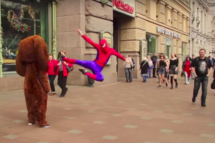 Пранкер Зеленый Купорос снял ролик про петербургского Человека-паука. На видео мужчина в костюме популярного супергероя напивается, ползает по эскалатору в метро, карабкается по Вантовому мосту, прыгает по крыше речного трамвая, прыгает в воду и сражается с Чебурашкой на Невском проспекте.