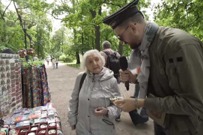 Комик Сергей Мезенцев спросил у петербуржцев про отпуск. И показал пенсионерке, как работает спиннер