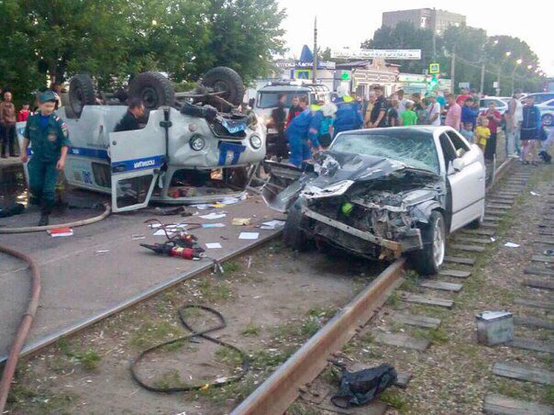 Столкновение произошло на перекрестке улиц Чайковского и Ворошилова. Водитель автомобиля марки Toyota влетел в полицейский УАЗ-"буханку". От удара автомобиль ППС перевернулся на крышу, а виновник ДТП вылетел на железнодорожные пути.