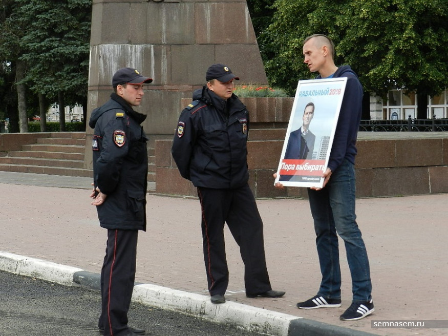 Во время акции вокруг площади Ленина прогуливались двое полицейских, которые поинтересовались у Борисова, с какой целью он стоит с портретом Навального.