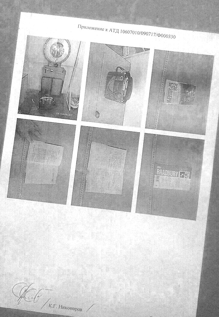 Error rendering VK.Как ни странно, речь не идет о знаменитом романе Брэдбери "451 по Фаренгейту", в котором описывается общественное устройство, карающее даже за хранение книг. По словам Курочкина, он всего лишь вез в багаже автобиографическую повесть Брэдбери "Дзен в искусстве написания книг", увидевшую свет в далеком 1973-м году. В комментариях к записи Курочкин предположил, что таможенникам показалось подозрительным слово "дзен" в названии книги и выложил копию приложения к Акту таможенного досмотра. На фотографии видно, что книгу Брэдбери, как улику на месте преступления, аккуратно измерили линейкой, взвесили и сфотографировали со всех сторон.