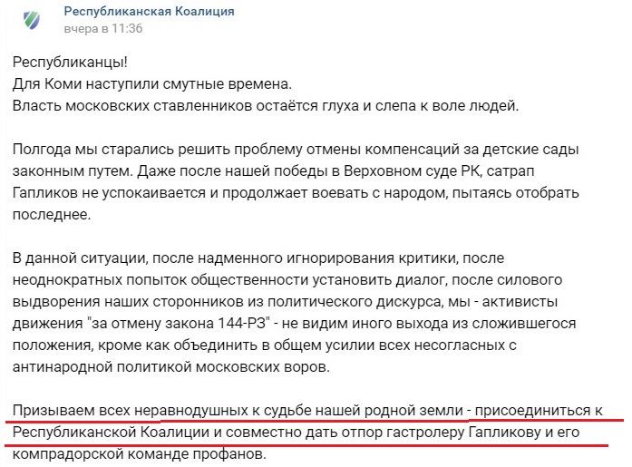 Из переписки Егора Русского, явно следует, что он в свои ряды собирает всех без исключения, и коммунистов, и ЕдРосов (которые в госсовете незаконно протащили закон 144-РЗ) и Справедливую Россию. Это будет такая сборная солянка из всех тех, кто еще недавно рукоплескал Гапликову, из тех, кто довел республику до банкротства и лишил самостоятельности, из дармоедов партийцев нашего режима.
