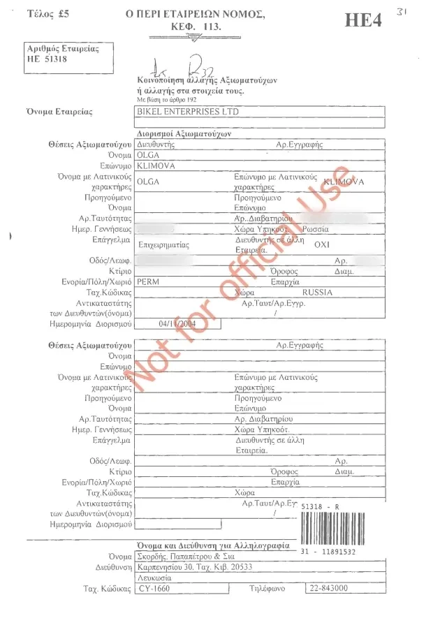 «Новая газета» получила официальные выписки из государственного реестра юридических лиц Кипра и обнаружила, что с 90-х до 2004 года директором Bikel Enterprises Ltd числился будущий сенатор, а в то время депутат Госдумы, Андрей Климов.