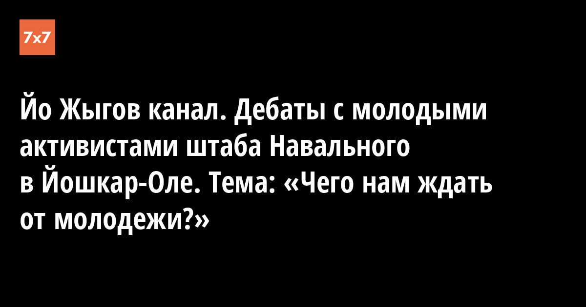 Дата13.07.2017АвторЦитатаИсточник7x7 | Горизонтальная РоссияСохранённая копияInternet ArchiveOriginal MaterialShow translationЙо Жыгов канал. Дебаты с молодыми активистами штаба Навального в Йошкар-Оле. Тема: «Чего нам ждать от молодежи?»* В материале упомянута организация Штаб Навального, деятельность которой запрещена в РФ