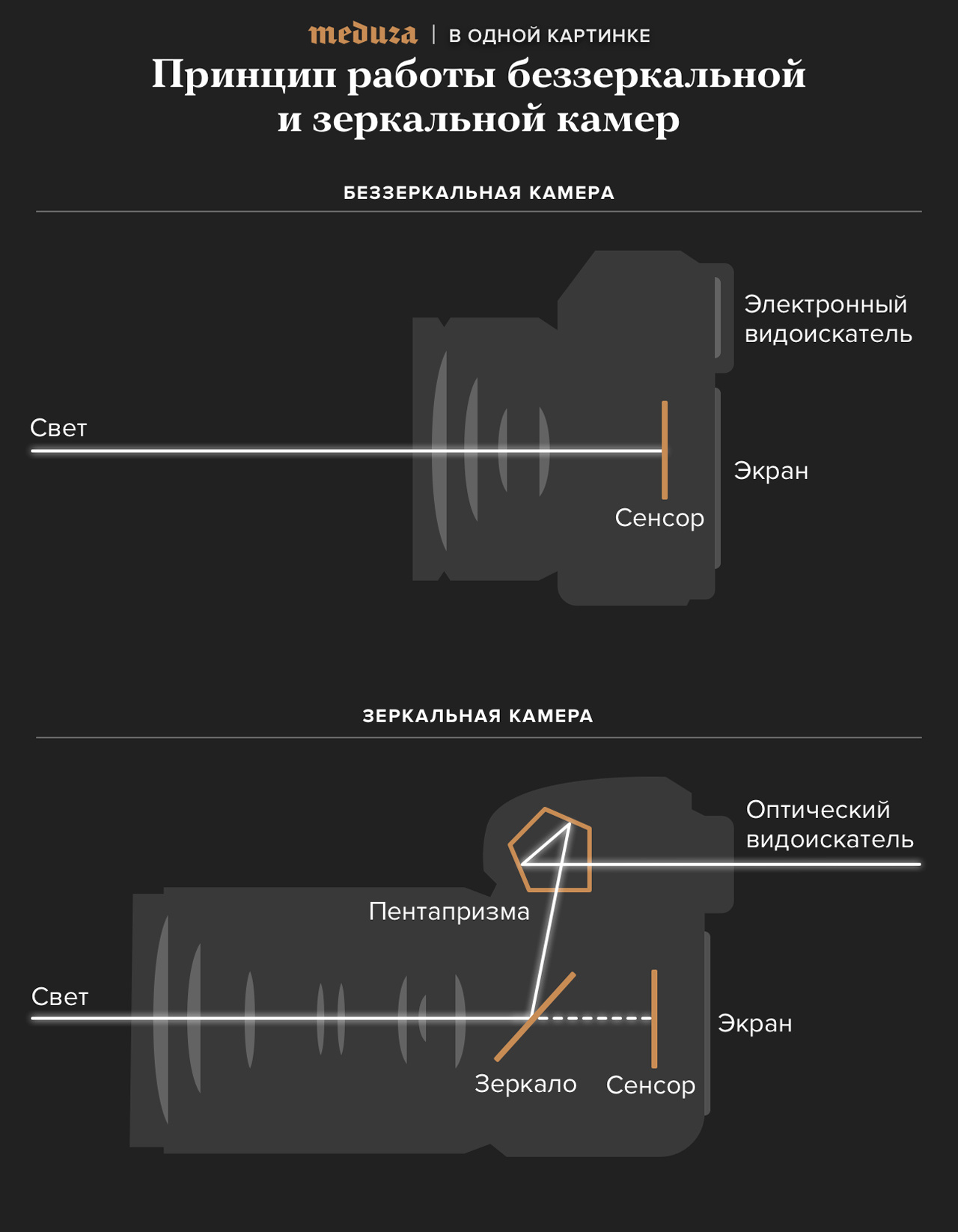 Сегодняшние зеркальные камеры унаследовали принцип работы камер 1950-х годов. Проходящий через объектив свет, отражаясь от зеркала, попадает в пентапризму. В ней кадр отражается еще два раза и попадает в оптический видоискатель, в который мы заглядываем перед тем, как сделать фотографию. Перед самым щелчком затвора зеркало поднимается, и свет уже без преград попадает на матрицу фотоаппарата, после чего картинка оказывается на флешке.