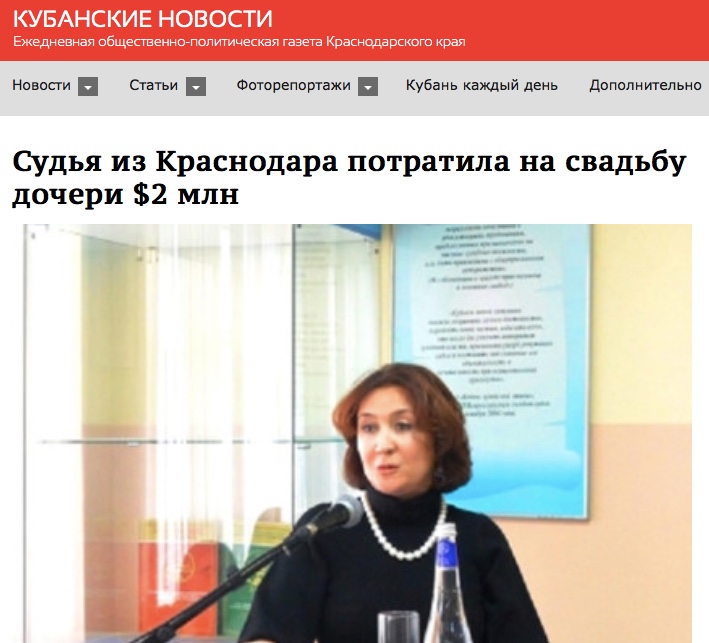 Так, газета «Кубанские новости», учредителем которой является администрация Краснодарского края, опубликовала новостную заметку под заголовком «Судья из Краснодара потратила на свадьбу дочери $2 млн».