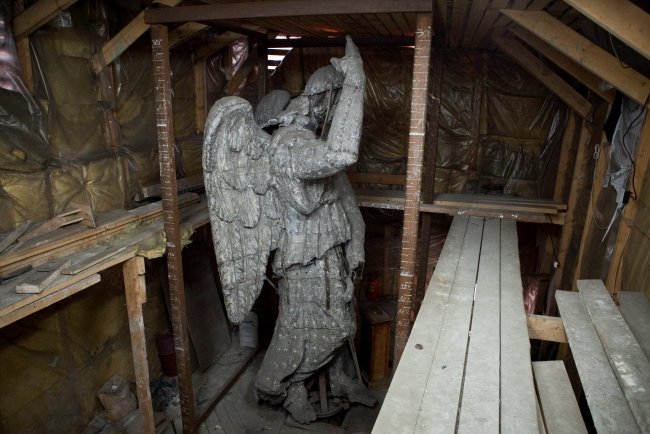 В начале этого месяца, когда петербуржцы хватились пропавшего со двора Ангела (а также исчезнувшего с ним заодно гипсового соседа), на сайте прихода появилось краткое сообщение: «9 июня гипсовая модель Ангела была подготовлена к транспортировке для последующего изготовления скульптуры, которая вернется на купол храма. 30 июня скульптура Ангела вывезена в реставрационную мастерскую».