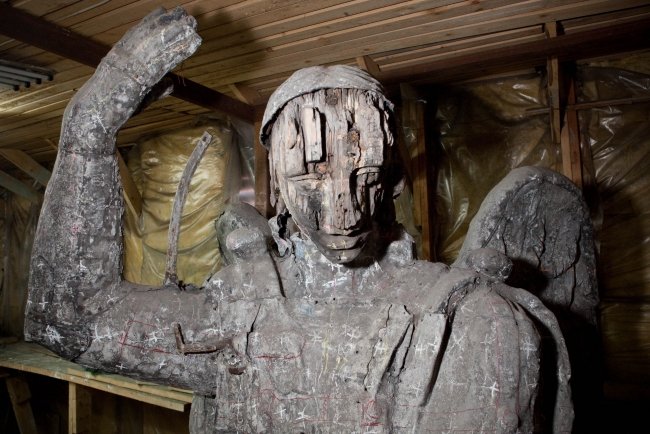 Предстоящая работа требует исключительного мастерства и профессиональной порядочности. Заключение обследования, проведенного в августе минувшего года, неутешительно. Читаешь, словно приговор медиков на распутье между реанимацией и моргом: «отрыв кисти левой руки, державшей крест», «общая деструкция древесины: трещины, сколы, раскрашивание в труху, поражение грибами, признаки наличия бурой гнили», «коррозия металла».