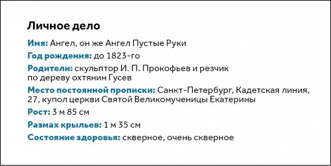 В этом самом умышленном городе чего только не встретишь. Например, дворового ангела. К сколоченной специально для него деревянной будочке одно время даже указатель был, объявление возле церковных ворот по Кадетской линии: «Проход к Ангелу до 22 часов». Многие успели с ним подружиться, наведывались при всяком удобном случае. А тут глядь – нет его. Говорят, отправлен на лечение. Поиски «лечебницы» привели к мастерской с неоднозначной репутацией.
