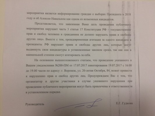 «Заявленная Вами цель проведения публичного мероприятия нарушает часть 3 статьи 17 Конституции РФ — „осуществление прав и свобод человека и гражданина не должно нарушать осуществления прав и свобод других лиц“. Вместе с тем, преждевременная агитация за одного кандидата в президенты РФ нарушает права и свободы других лиц, которые могут выдвинуть свои кандидатуры в установленные законом сроки, так как они в наименьшей степени смогут агитировать за себя», — сказано в отказе.